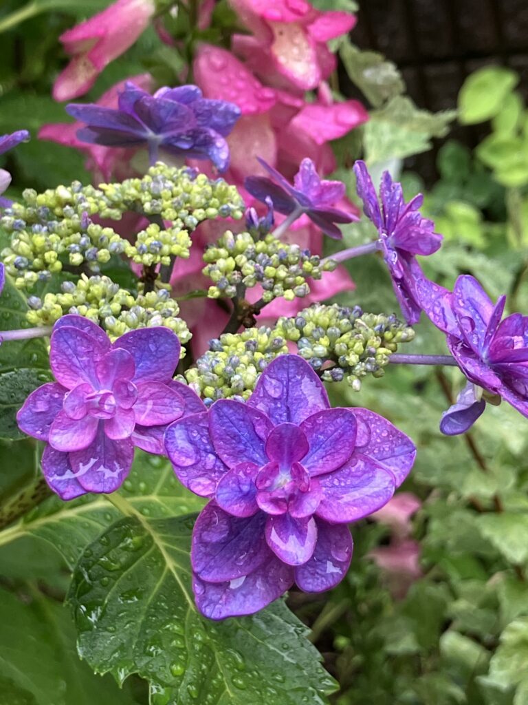 育て方合っていないのか、先祖帰りの途中なのか、ガクアジサイの真ん中の装飾花があったり無かったり。