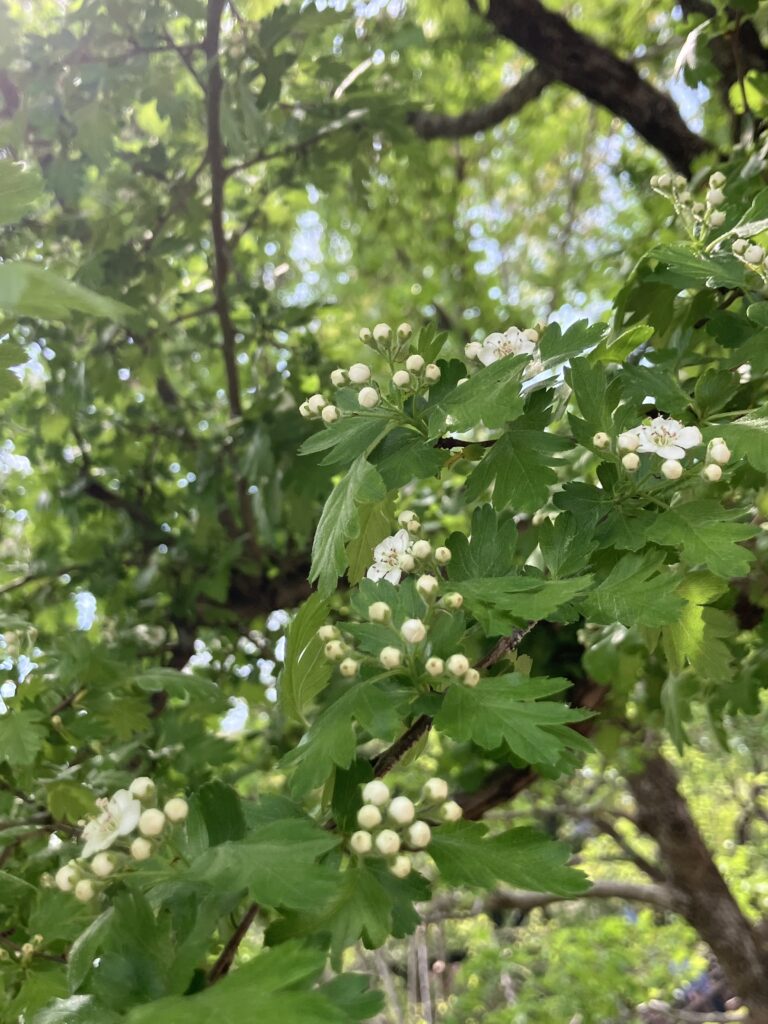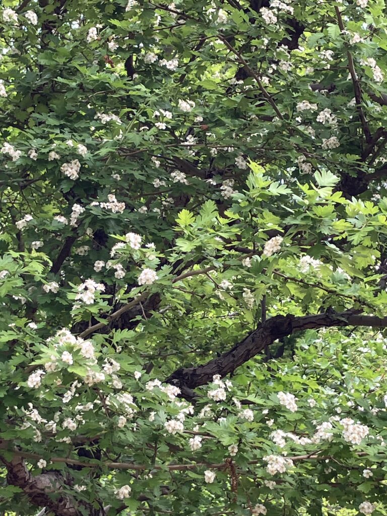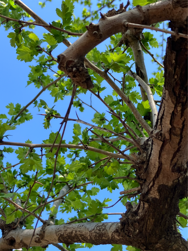 真っ黒に見えるこの山査子に春の終わり頃、白い花が咲いて、切れ込みの深い葉っぱがあって、いずれ赤い実がついて…。